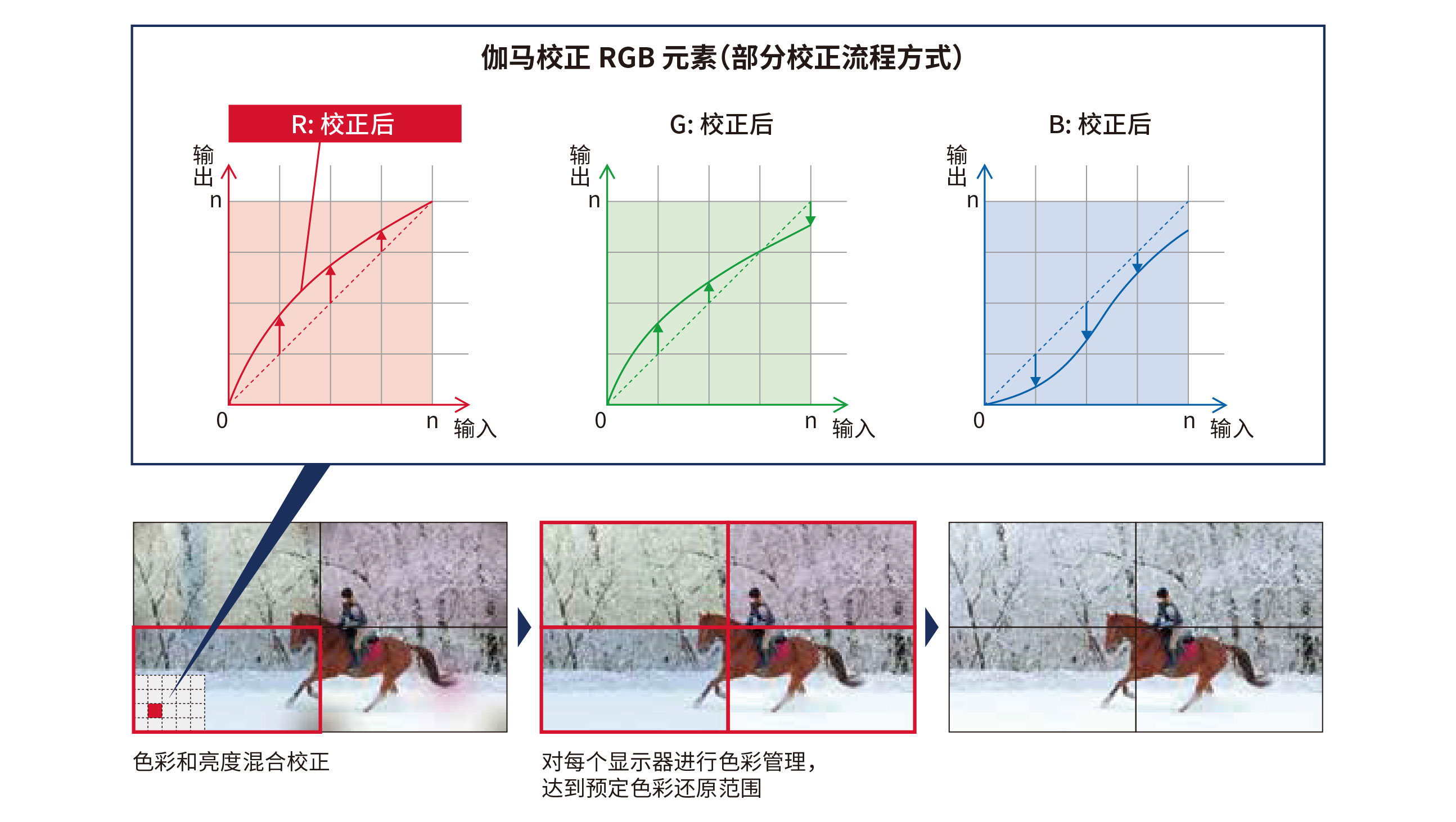 液晶顯示器上每個小區(qū)域的顯示性質由RGB輸入信號決定。這項技術能糾正每個RGB信號上色彩和亮度的不一致,請見右圖。應用在 PN-V701上的這項技術是經(jīng)過夏普改良過的升級技術,提升了準確度