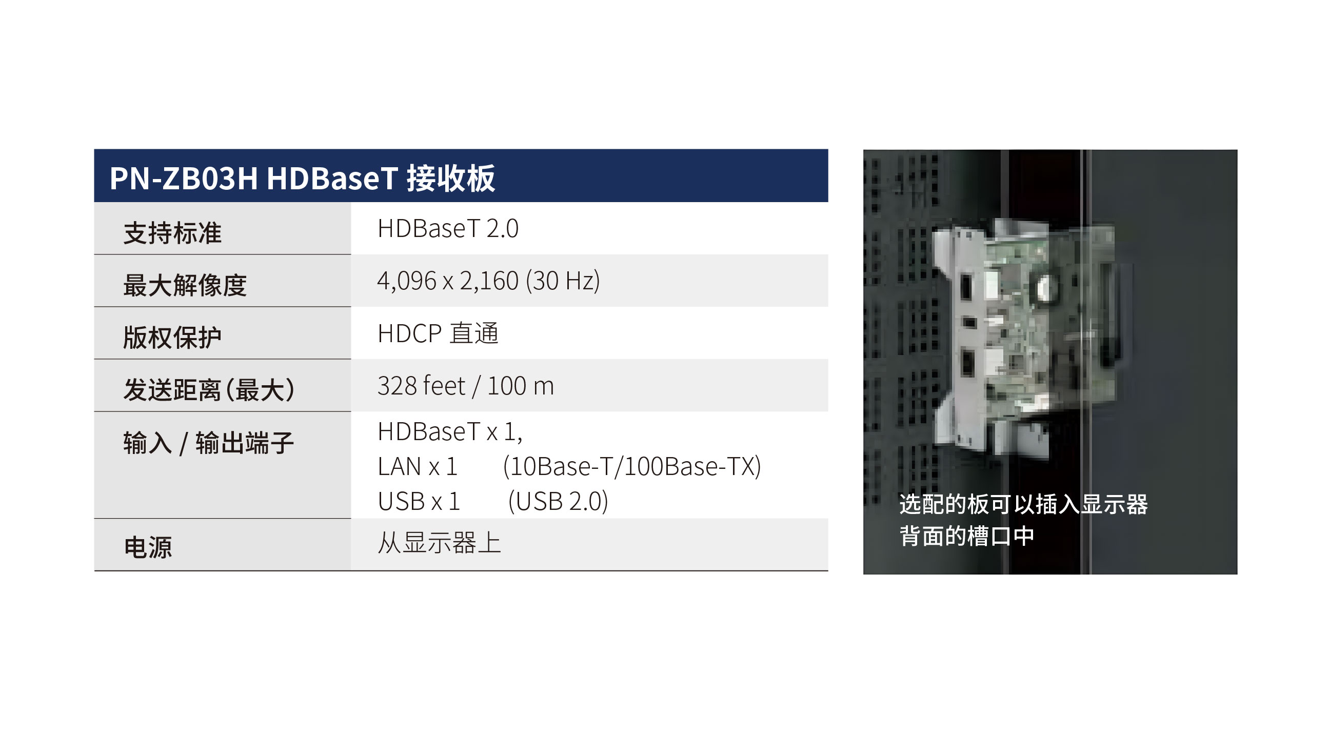 N-V701擁有一個擴充槽,用于安裝一個選配的HDBaseT接收板(PN-ZB03H)。顯示器可以通過一根局域網(wǎng)線纜。※1,接收100米內的HDMI視頻、音頻信號和控制信號。這為諸如電腦和藍光播放器等 HDMI設備提供便利的連接。與 HDBaseT2.0標準兼容讓您可以從一個與選配板*2相連的U盤上對電腦進行遠程操作。通過支持HDBaseT2.0,您可以使用盡量少的線纜,減少安裝時間和安裝成本?!? CAT-6 線纜或者保護度更高的線纜需另行購買?!? 需要一個HDBaseT2.0兼容的傳送器,需另行購買。并非支持所有U盤。