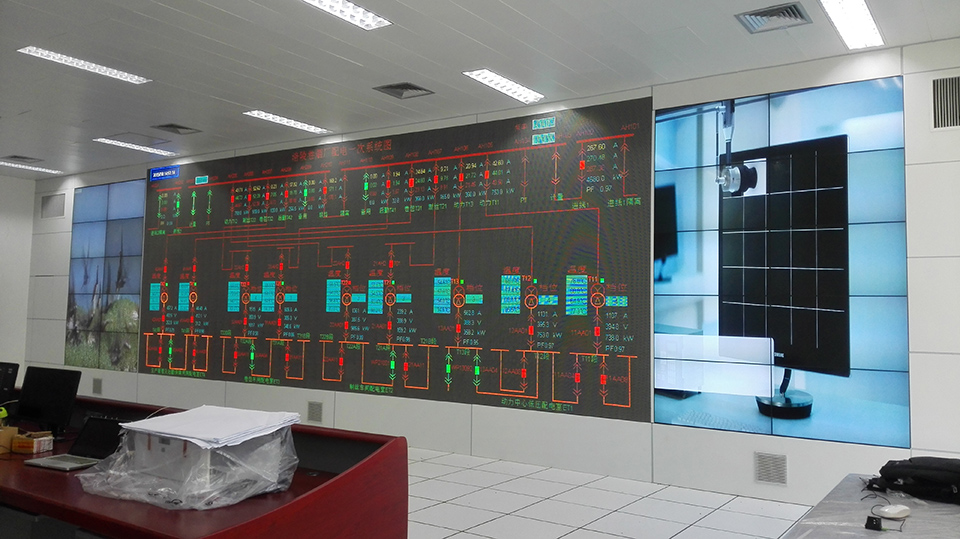 該套可視化調度監控管理系統的顯示部分由2塊液晶拼接墻及一塊LED大屏組成。用戶的作業現場視頻監控信號通過后臺圖像處理器處理后直接上屏顯示;生產流程、生產節點及數據由LED大屏顯示。除顯示端,在車間內安裝了視頻監控系統,生產實時狀況由傳輸系統傳輸至監控大廳,經處理后由顯示端顯示。