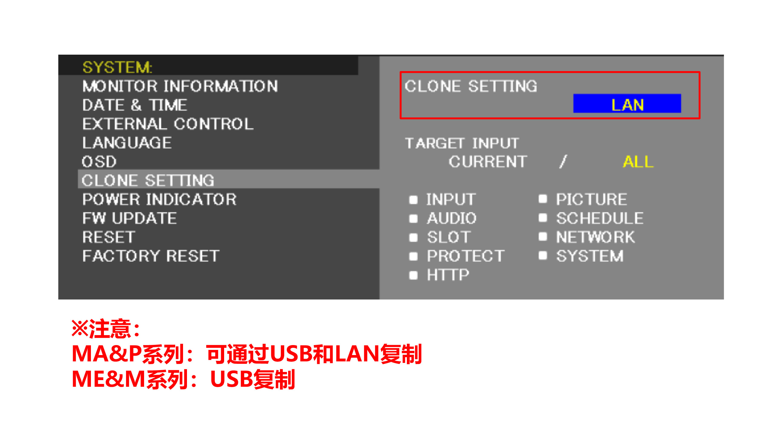 通過U盤或LAN,可將目標(biāo)顯示器的參數(shù)復(fù)制到指定顯示器