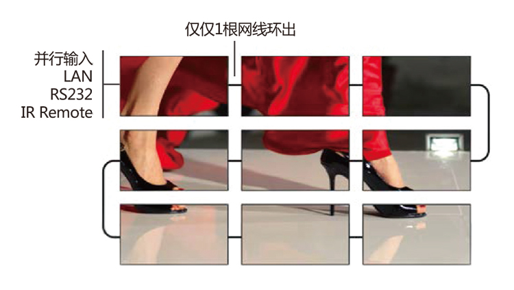 控制信號(hào)(RS232\LAN\IR Remote)通過一根網(wǎng)線(RJ45)環(huán)出;最大 可支持100臺(tái)顯示器的菊花鏈,有助于減少連接線纜和人力成本。